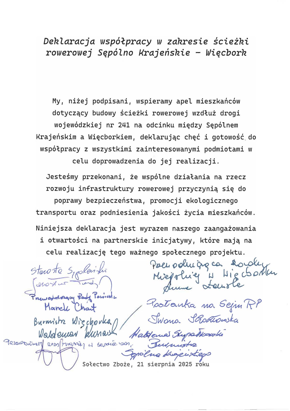 W rozmowach uczestniczyli: Starosta Sępoleński Jarosław Tadych, Dyrektor Zarządu Drogowego w Sępólnie Krajeńskim Edwin Eckert, Burmistrz Kamienia Krajeńskiego Natalia Marciniak, Burmistrz Sępólna Krajeńskiego Waldemar Stupałkowski, Burmistrz Więcborka Waldemar Kuszewski, Kierownik Referatu Rozwoju Gospodarczego, Inwestycji i Gospodarki Komunalnej w Kamieniu Krajeńskim Katarzyna Chodera oraz Kierownik Referatu ds. Rolnictwa, Ochrony Środowiska i Dróg Tomasz Fifielski.